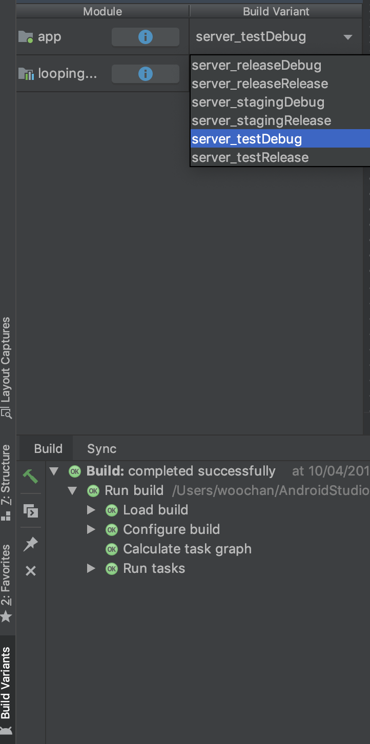 productFlavors에 원하는 url들을 추가하고 sync를 돌리고나면 안드로이드 스튜디오 좌측 하단에 Build Variants를 누르면 설정들이 보인다.