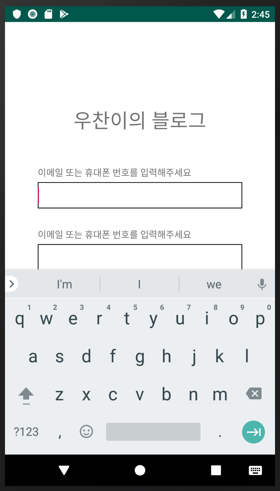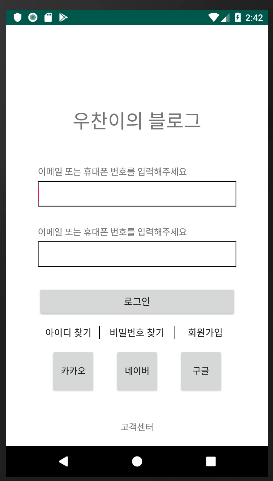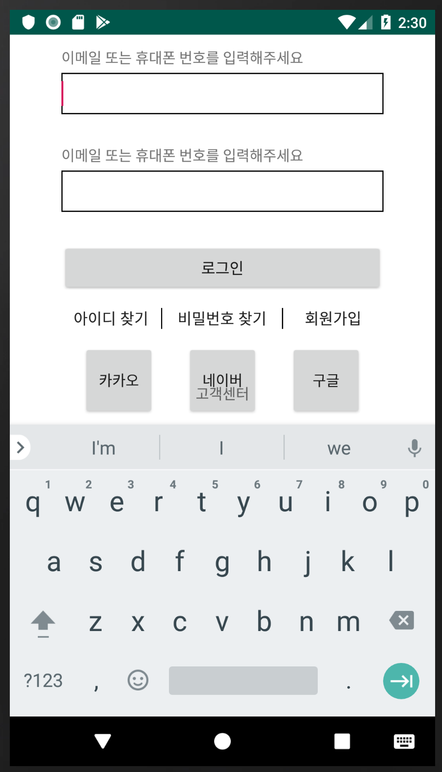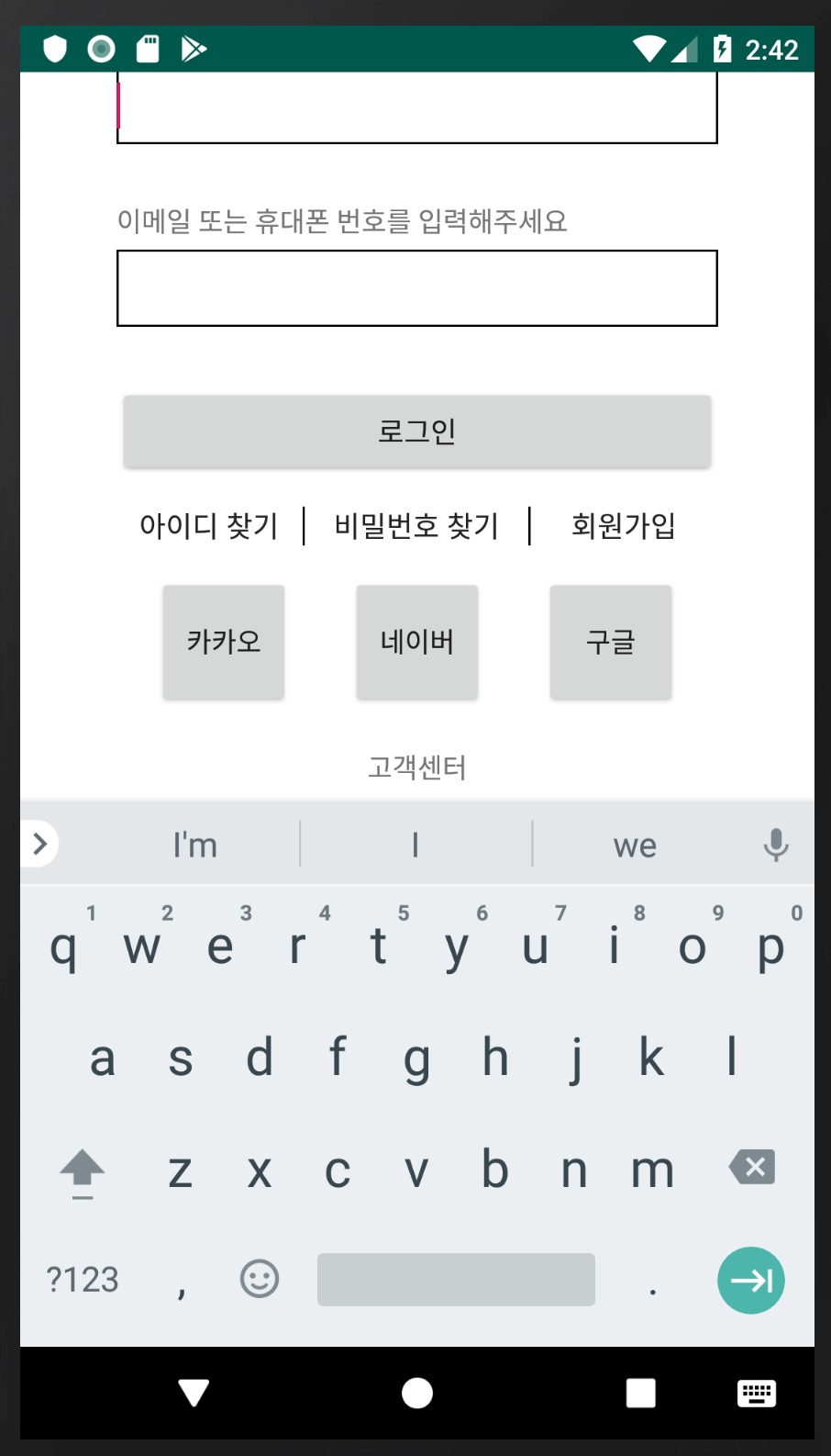 예를들어서 고객센터를 제외한 부분을 스크롤뷰로 잡고 상위 레이아웃을 Relative Layout으로 잡게되면, 언뜻 성공한것처럼 보이지만 키보드가 올라온 경우 다음과 같은 슬픈 결말을 맞이하게 된다.