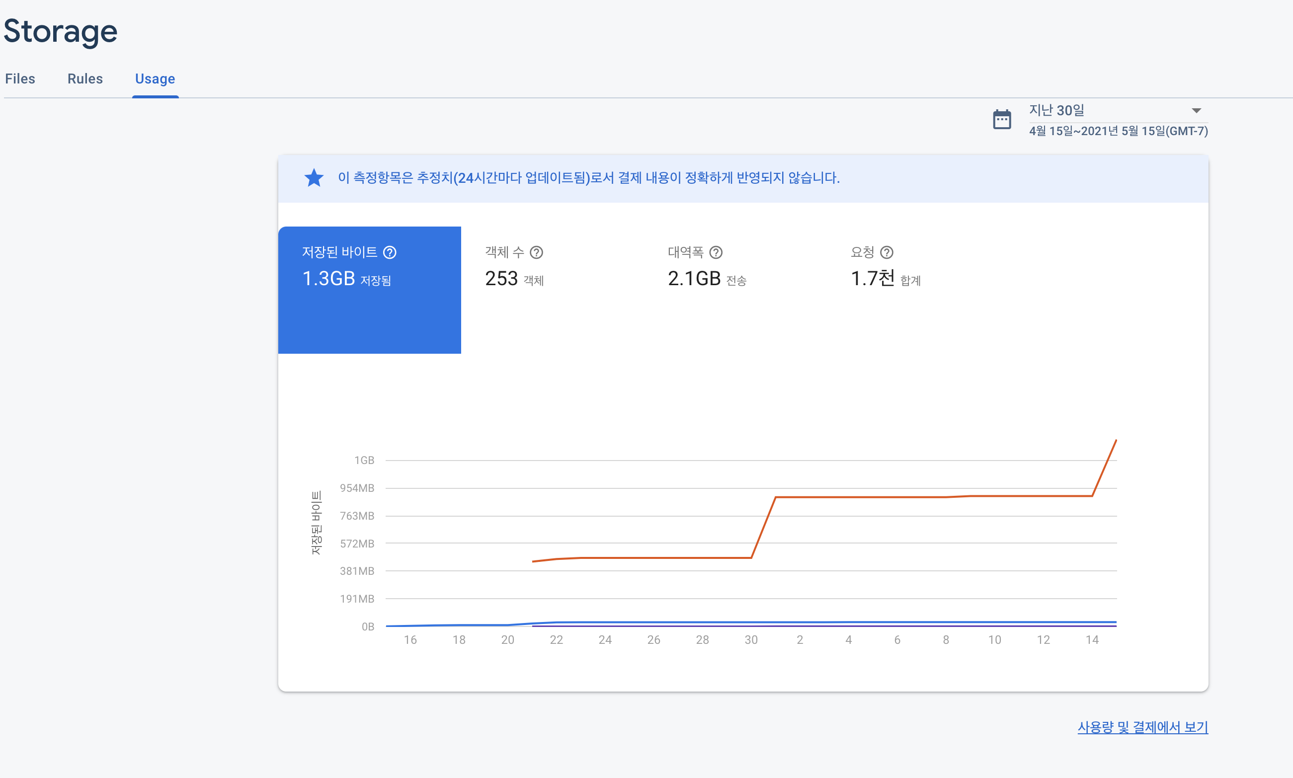 Storage에 이미지를 저장하긴 했지만, 너무 비정상적으로 높은 저장된 바이트가 나왔고, 심지어 Storage에 있는 모든 파일을 지워보았지만 이 수치가 떨어지지 않았다.